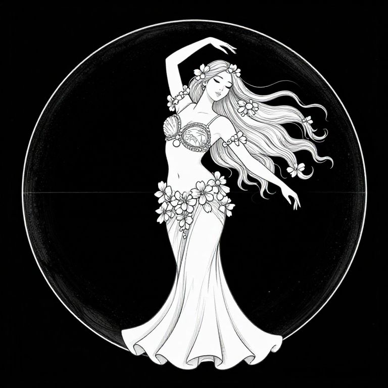 Black-and-white digital illustration of a dancing woman with flowing hair, wearing a floral dress and crown, against a circular black background.