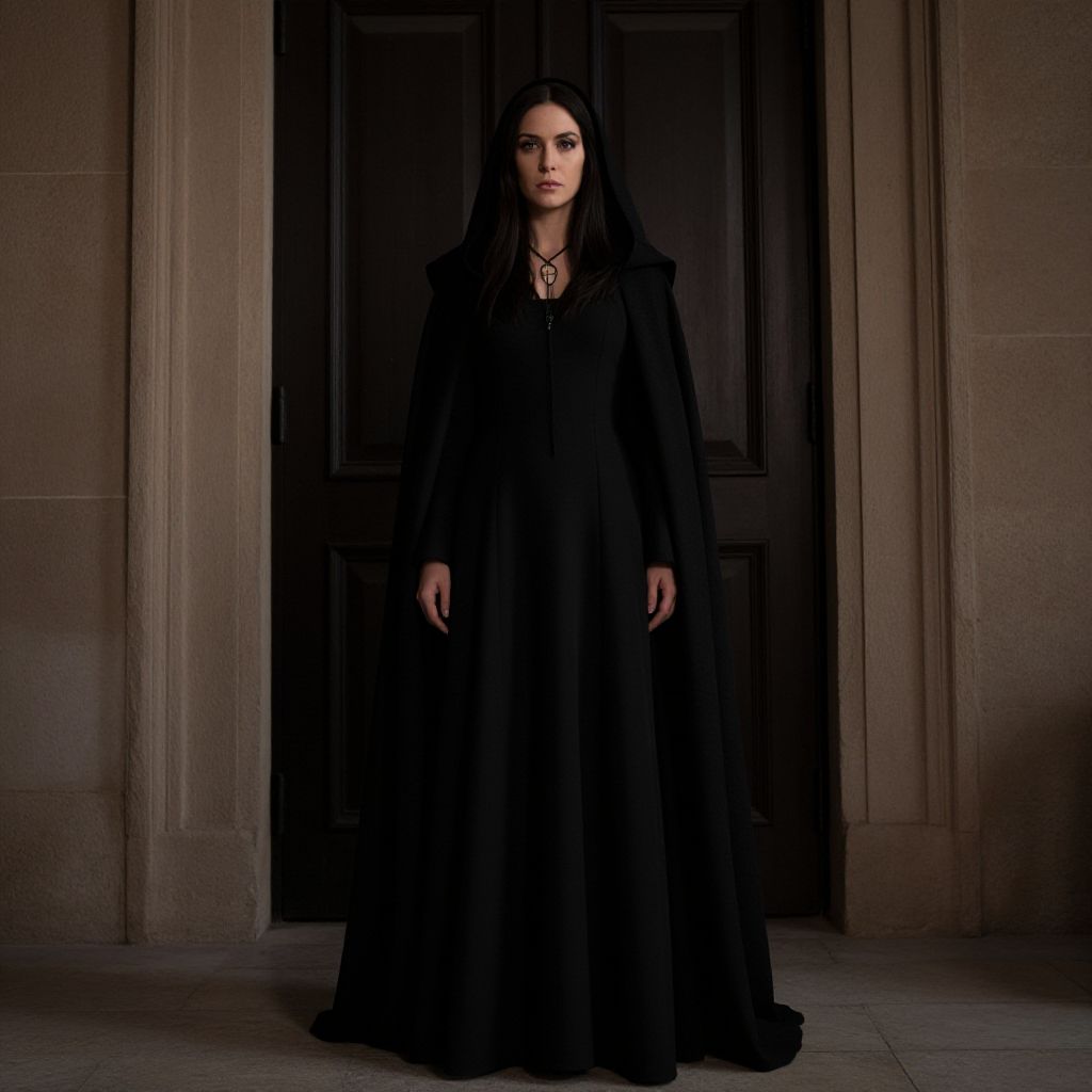 Photograph of a woman standing in front of a dark wooden door, surrounded by beige stone walls. She has pale skin, long dark hair, and wears a black, long-sleeved, flowing dress with a high collar. A black necklace with a circular pendant hangs around her neck. Her expression is neutral, and she stands with her hands by her sides. The lighting is dim, creating a dramatic, shadowy effect that emphasizes her dark attire and the muted tones of the background. The overall mood is mysterious and somber.