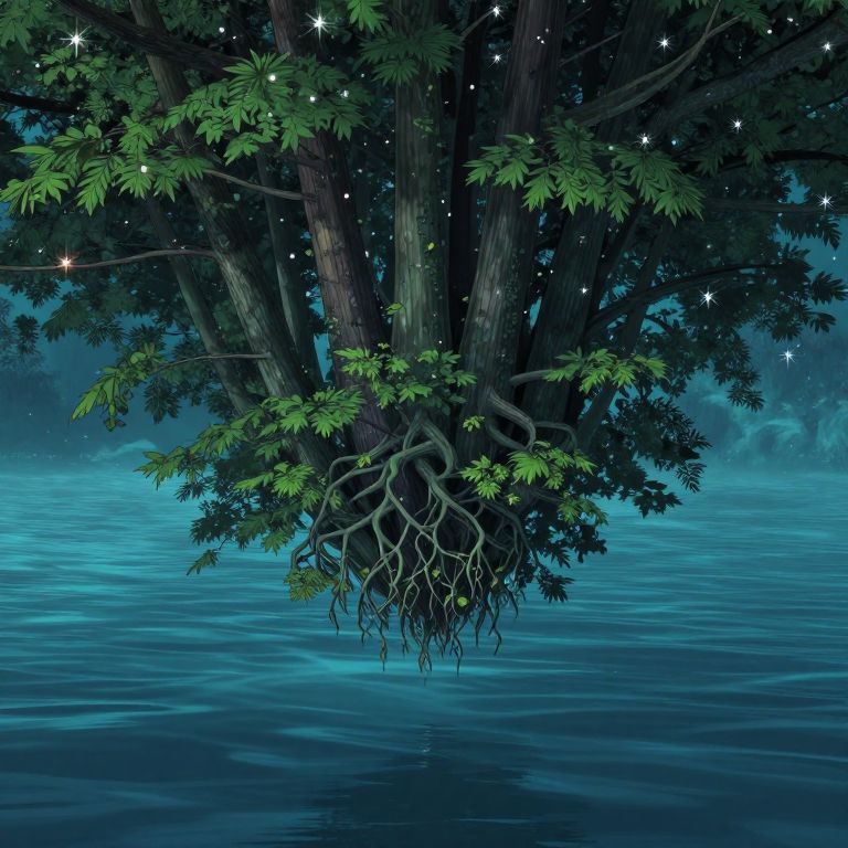 Digital art of a tree with visible roots emerging from a calm, starlit blue water surface, surrounded by sparkling stars.