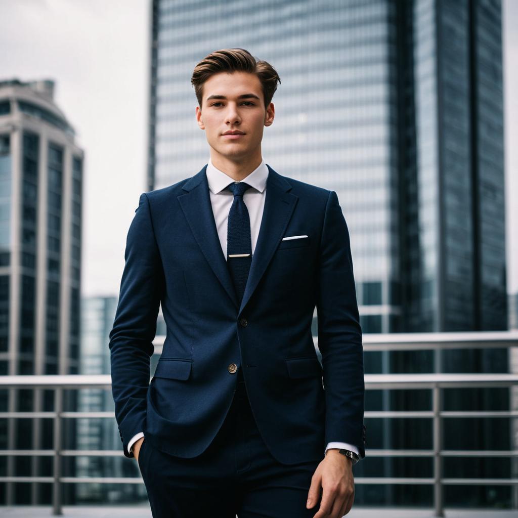 Photograph of a young European man in a stylish casual outfit, standing confidently in front of a modern glass building. Warm, flattering lighting with blurred background, taken with a high-end DSLR (Canon EOS R or Sony A7 III) using an 85mm lens, conveys confidence and success.