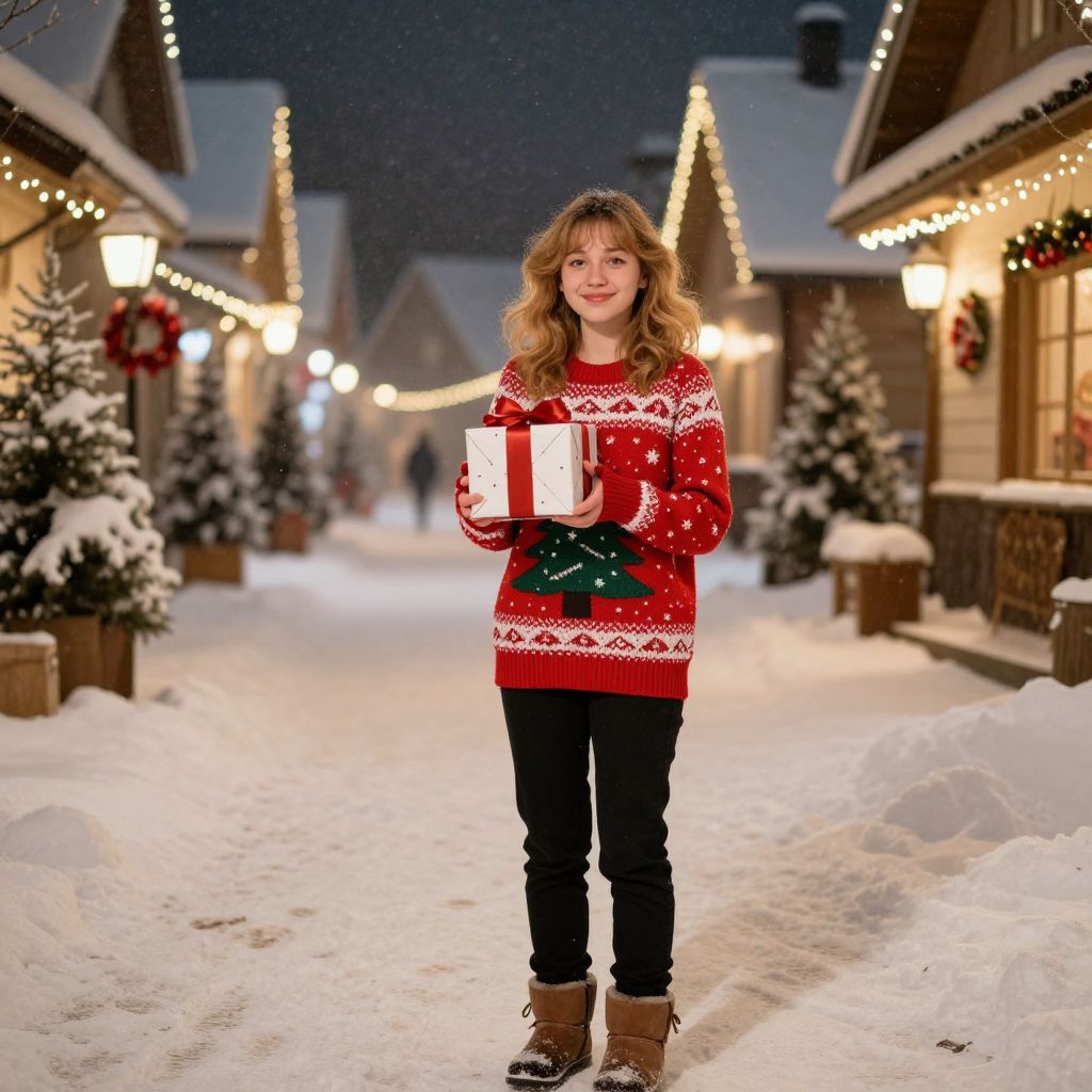 A young woman with warm brown eyes and soft, wavy blonde hair, standing in a cozy winter setting, wearing a vibrant red and white Christmas sweater featuring a detailed green Christmas tree printed on the front, paired with warm black pants and cozy ankle boots. She smiles gently, holding a beautifully wrapped gift in her hands, her expression full of joy and warmth. The scene is set in a snowy village street with twinkling lights glowing softly in the night, snow-covered pine trees stretching into the distance, and a few festive decorations like hanging ornaments and wreaths adding to the magical atmosphere. The lighting is soft and golden, capturing the cozy, heartwarming essence of a winter holiday evening.