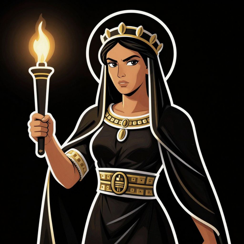 Digital illustration of a fierce, dark-haired queen in black robes, gold crown, and belt, holding a torch, with a halo against a black background