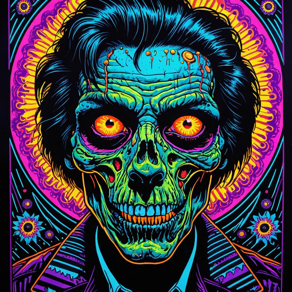 70s black light poster, vibrant glowing textures, psychedelic, high quality, ink art, retro, punk, zombie, vibrant colors, neon lighting, oozing details, vintage, psychedelic art, psychedelic fashion, vibrant eyes