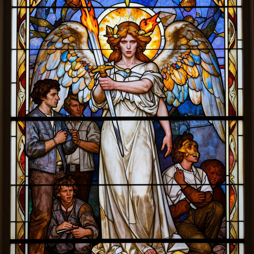 A stained glass window portrait of a terrifyingly beautiful angel wielding a flaming sword, by stanley artgerm lau , greg rutkowski, thomas kindkade, alphonse mucha, loish, norman rockwell