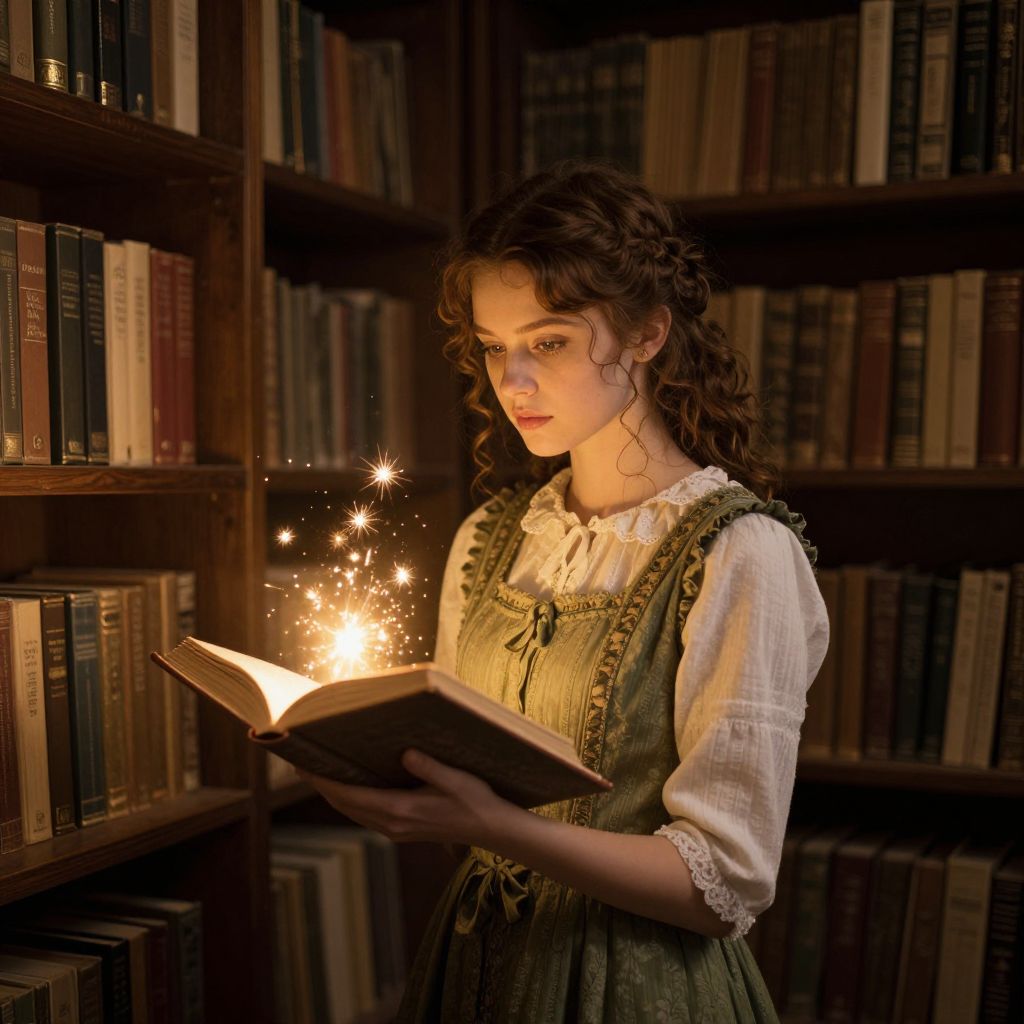 Photograph of a young woman with curly brown hair, wearing a white blouse with puffed sleeves and a green, lace-trimmed dress, standing in a dimly lit library. She holds an open book emitting glowing, sparkling lights, illuminating her focused expression. The background features tall wooden bookshelves filled with various books, creating a warm, mystical atmosphere. The lighting highlights her face and the magical glow from the book, contrasting with the dark, shadowy shelves. The texture of her dress and the bookshelves adds a rich, vintage feel to the image.