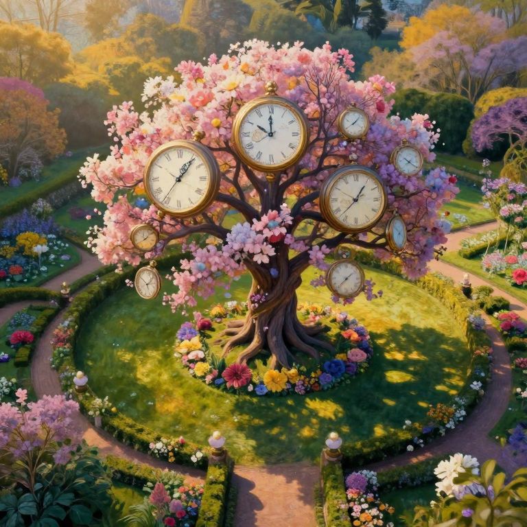 Fantastical digital artwork of a cherry blossom tree with clock faces instead of leaves, surrounded by vibrant garden paths and colorful flowers.