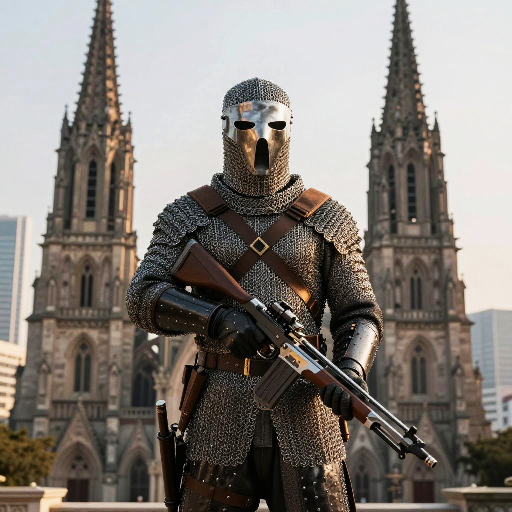Photorealistic digital art of armored, masked figure with rifle standing in front of Gothic-style cathedral with two tall spires.