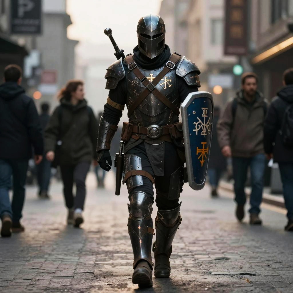 Portrait of a modern day crusader clad in a blend of traditional chainmail and contemporary combat gear, holding a futuristic crossbow, standing in front of a ruined cathedral merged with skyscrapers, twilight setting, hyper-realistic details.