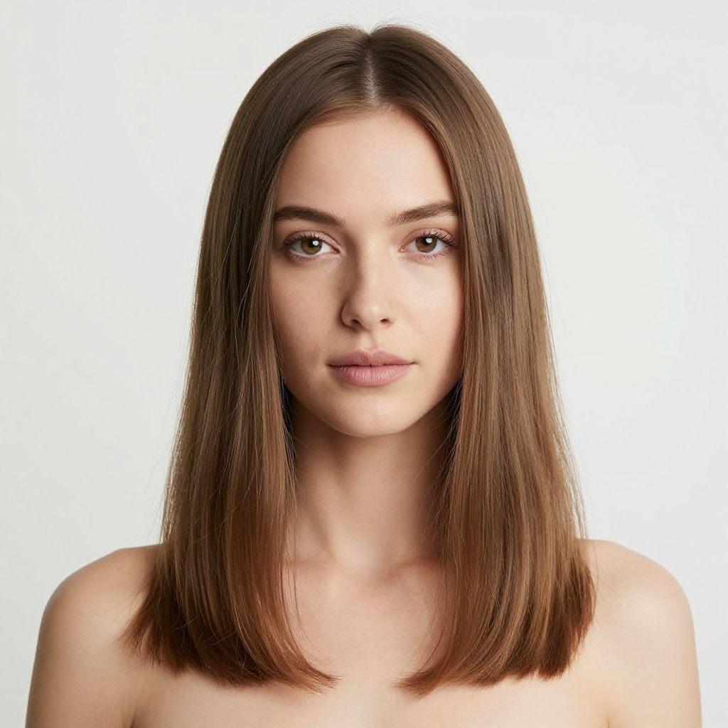 Caucasian woman with Tapered Long Cut hairstyle, balanced and symmetrical, long straight hair with subtle tapering at the sides, natural hair texture, fresh and clean look, soft white background, studio lighting, modern portrait, realistic and trustworthy aesthetic.