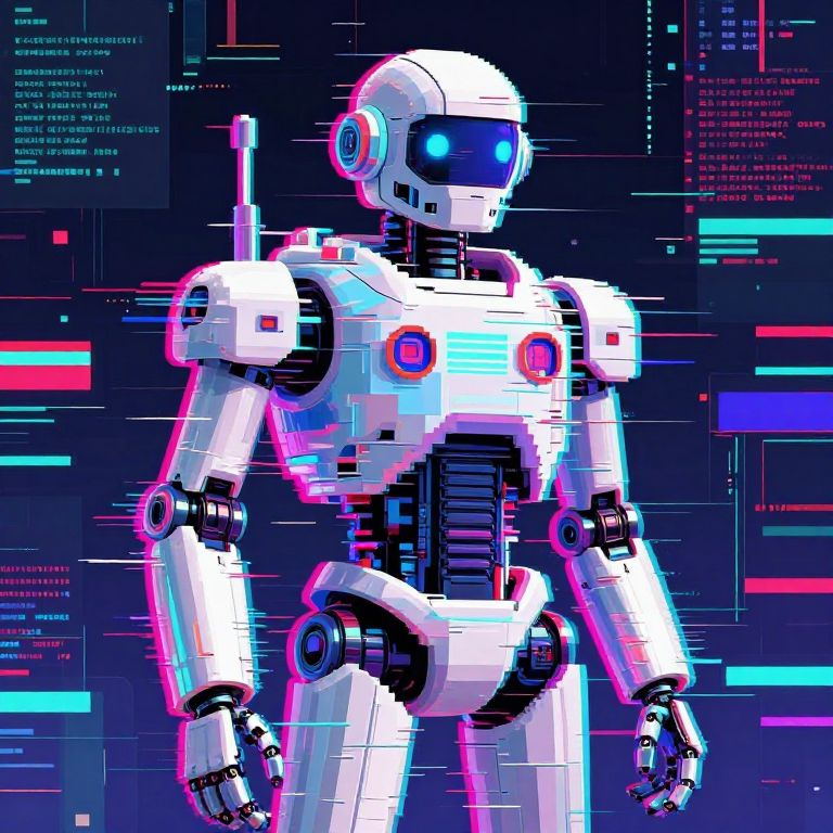 Glitch art style retro-futuristic robot with pixelated distortions and color banding effects, set against a high-tech background filled with floating data streams and glitch overlays, evoking a cyberpunk atmosphere with corrupted digital imagery.
