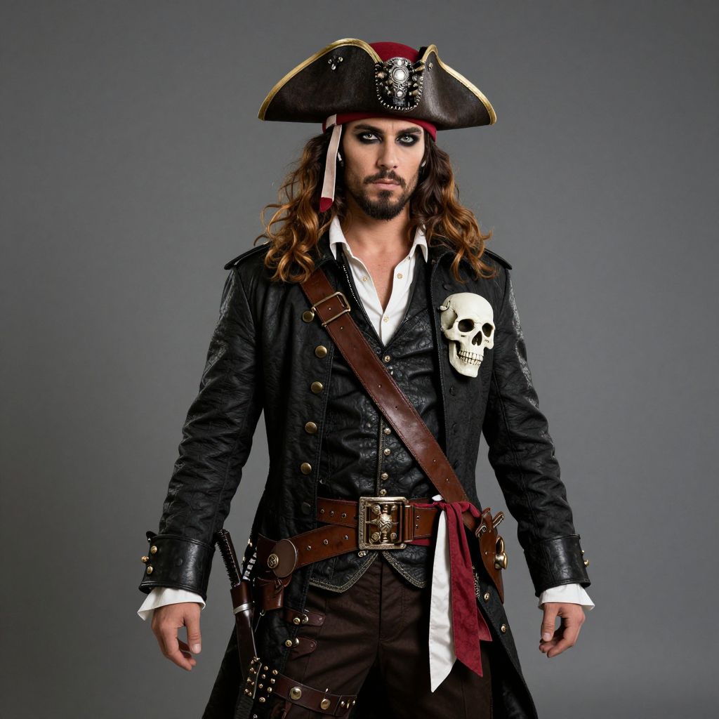 Pirate Steampunk Costume, pirate in a red hat and black jacket with a skull on his chest