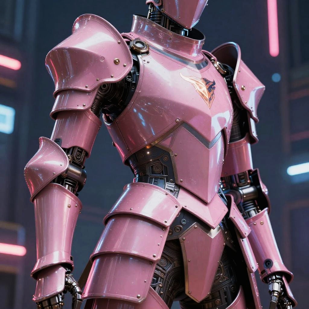 Close-up of pink knight armor with reflective surfaces, futuristic medieval fusion style, intricate mechanical joints, illuminated by neon lights in a dark sci-fi city