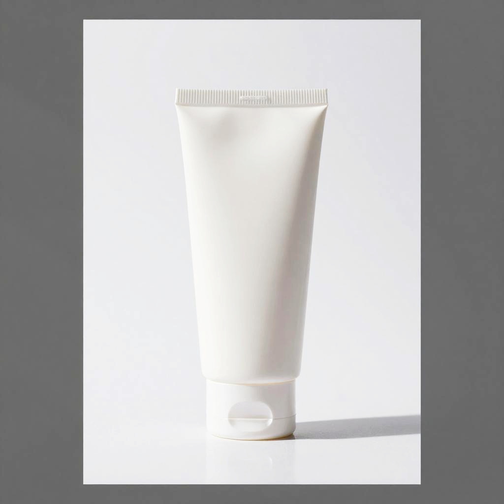 Photograph of a white, ribbed, plastic tube of lotion standing upright on a bright, reflective surface. The background is a stark white with a grey border on the left and right edges. The tube casts a subtle blue shadow to the right, adding depth to the image. The lighting is bright and even, highlighting the tube's smooth texture and clean design.