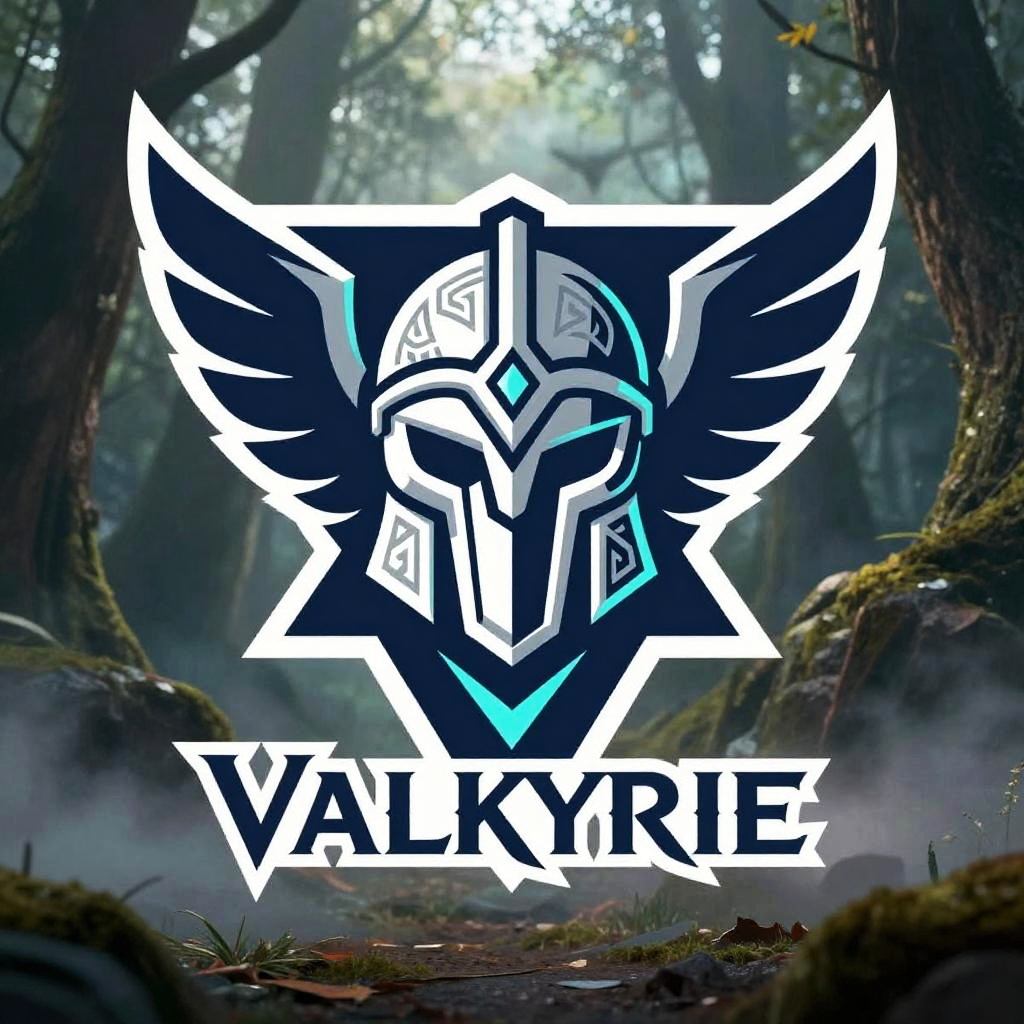 Valkyrie logo, inspired by Marvel comics, bold and angular design featuring a winged warrior helmet, intricate Norse patterns engraved, glowing cyan highlights, mysterious misty forest background, cinematic lighting, heroic and majestic.