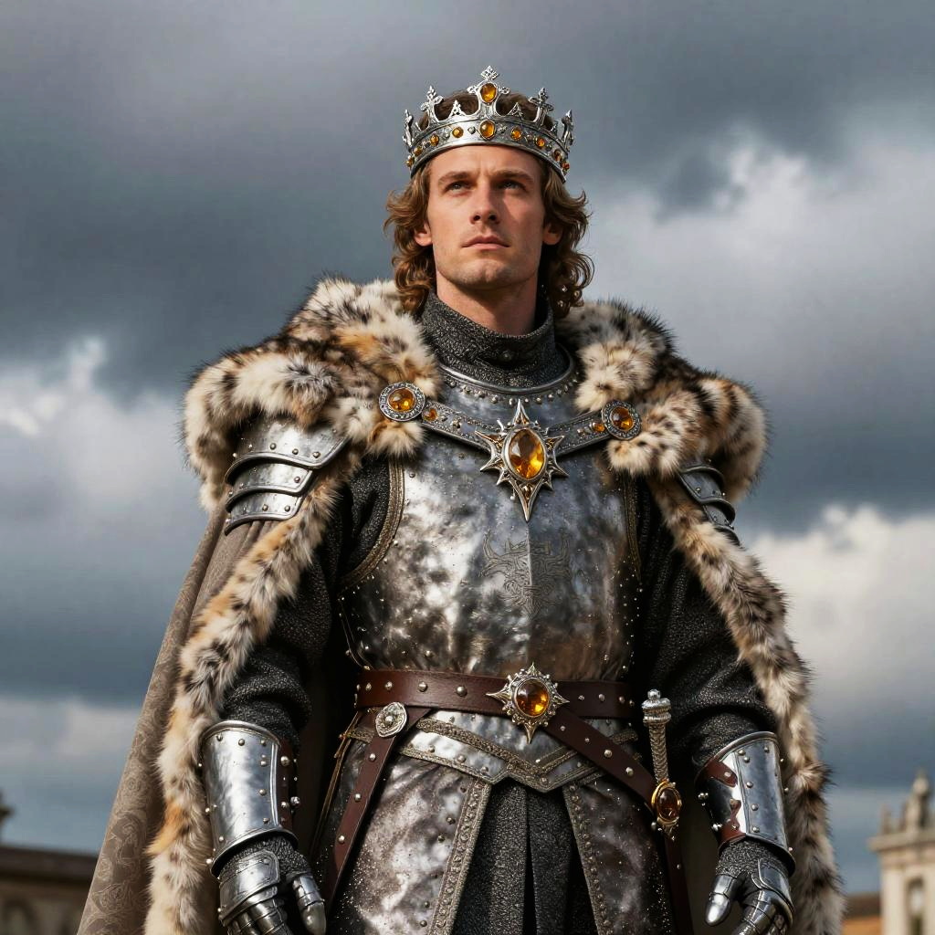A regal man dressed in medieval-inspired armor and a luxurious fur-trimmed cloak stands confidently against a dramatic cloudy sky. He wears an ornate silver crown adorned with amber gemstones, emphasizing his royal status in a fantasy setting.