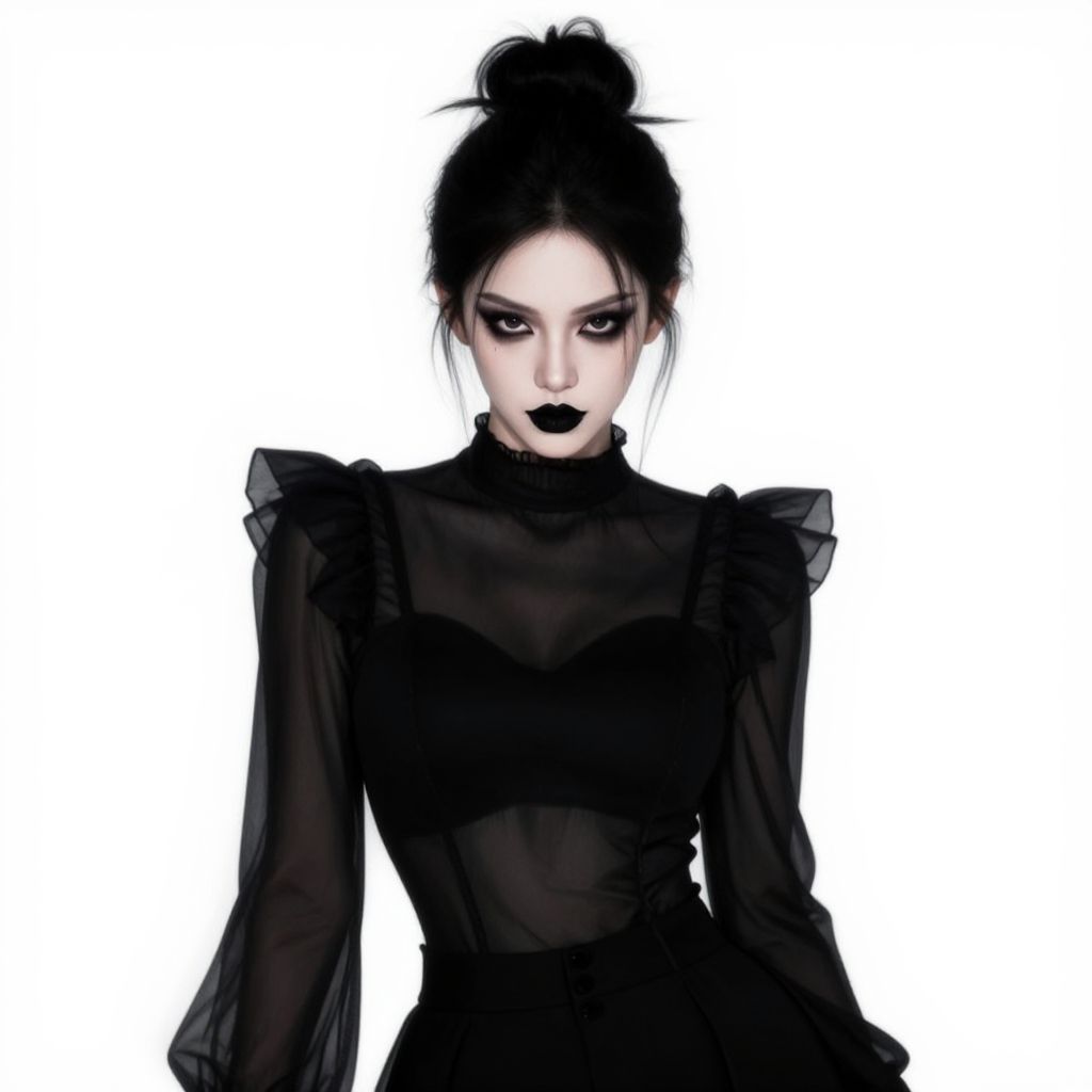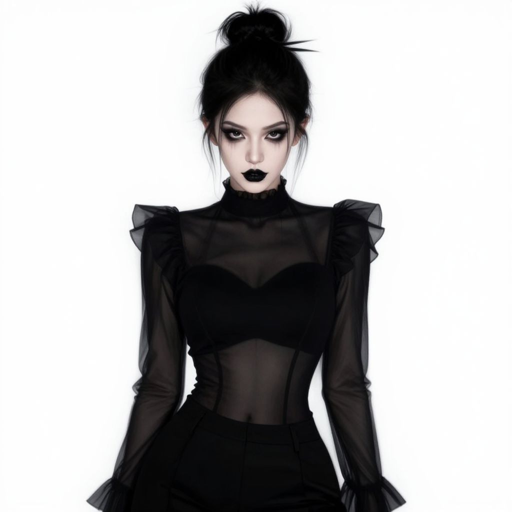 A digital illustration of a pale-skinned woman with dark, dramatic makeup, including bold black lipstick and dark eyeliner. She has black hair styled in a high bun. She wears a black, sheer, long-sleeve top with ruffled shoulders and black pants. The background is plain white, making her the clear focus. The style is gothic and edgy, with a strong, mysterious vibe.