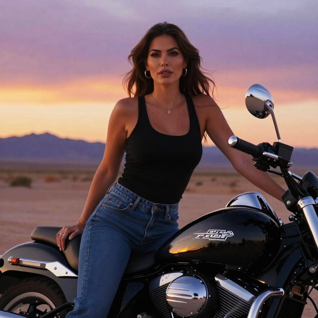 Photograph of a confident woman with long, wavy brown hair riding a sleek black motorcycle on a desert road at sunset. She's wearing a black sleeveless top and high-waisted blue jeans, with her gaze turned back over her shoulder. The sky is a gradient of orange and purple, with the sun low on the horizon. The desert landscape is barren and stretches into the distance.