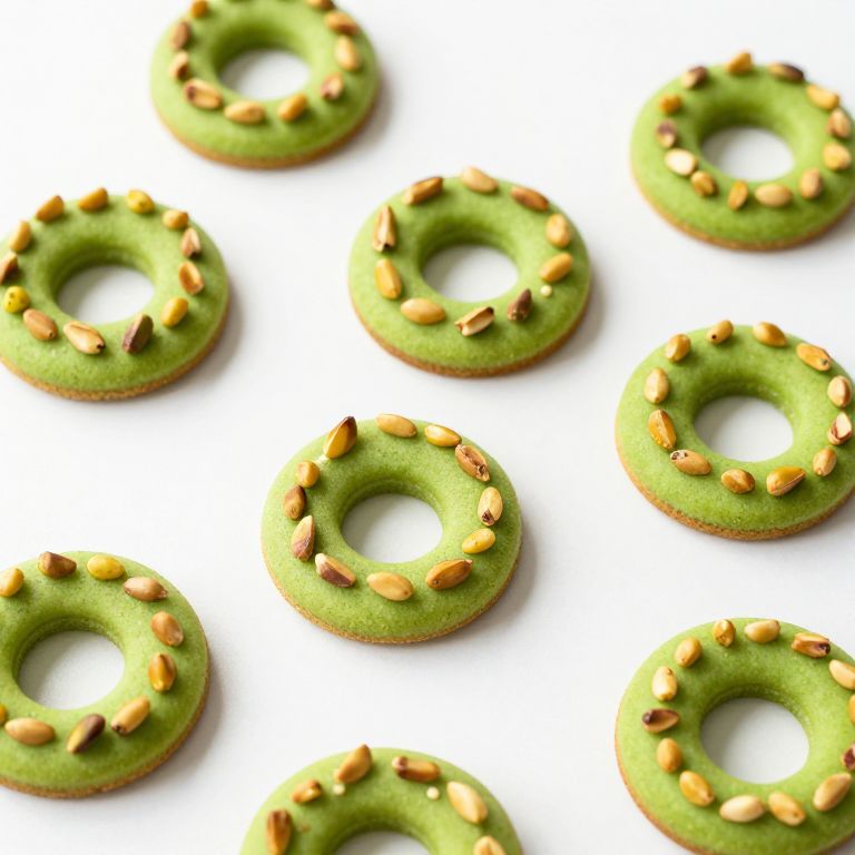 Scattered across a pristine white surface, eight vibrant green lemon-pistachio wreath cookies are artfully arranged, each adorned with a ring of golden pine nuts encircling their hollow centers.