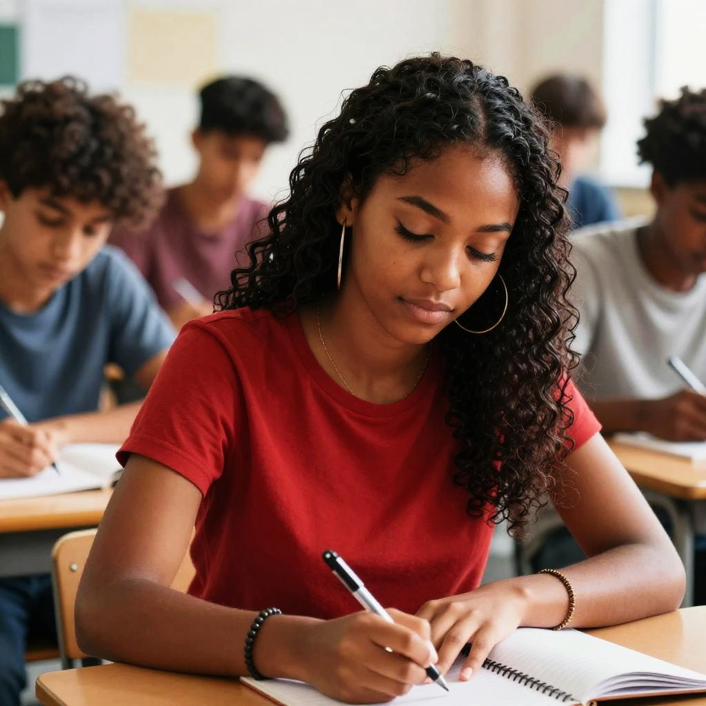 A group of diverse high school students sitting at desks in a classroom. The girls are wearing white shirts and denim jeans, while the boys are wearing red long-sleeve shirts and blue pants. The classroom has a chalkboard on the wall and large windows with white curtains. Students are focused, writing in notebooks during a lesson.