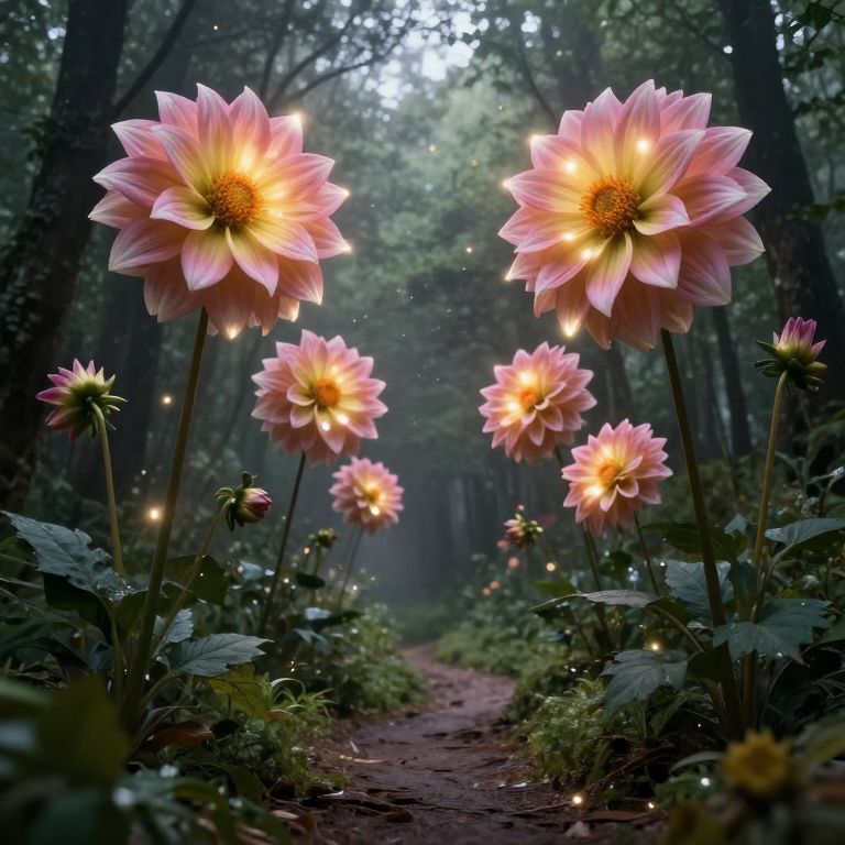 This photograph depicts a mystical forest scene with large, vibrant pink and yellow dahlias in full bloom. The flowers, with glowing centers, stand tall on slender green stems, their petals radiating a soft, ethereal light. The forest path, lined with lush green foliage, leads into a misty, sunlit background. Tiny, glowing fairy lights float around the flowers, adding a magical touch. The trees in the background are tall and dark, with sunlight filtering through the dense canopy, creating a serene, enchanted atmosphere. The image has a dreamy, almost surreal quality, with a focus on the natural beauty and magical elements.