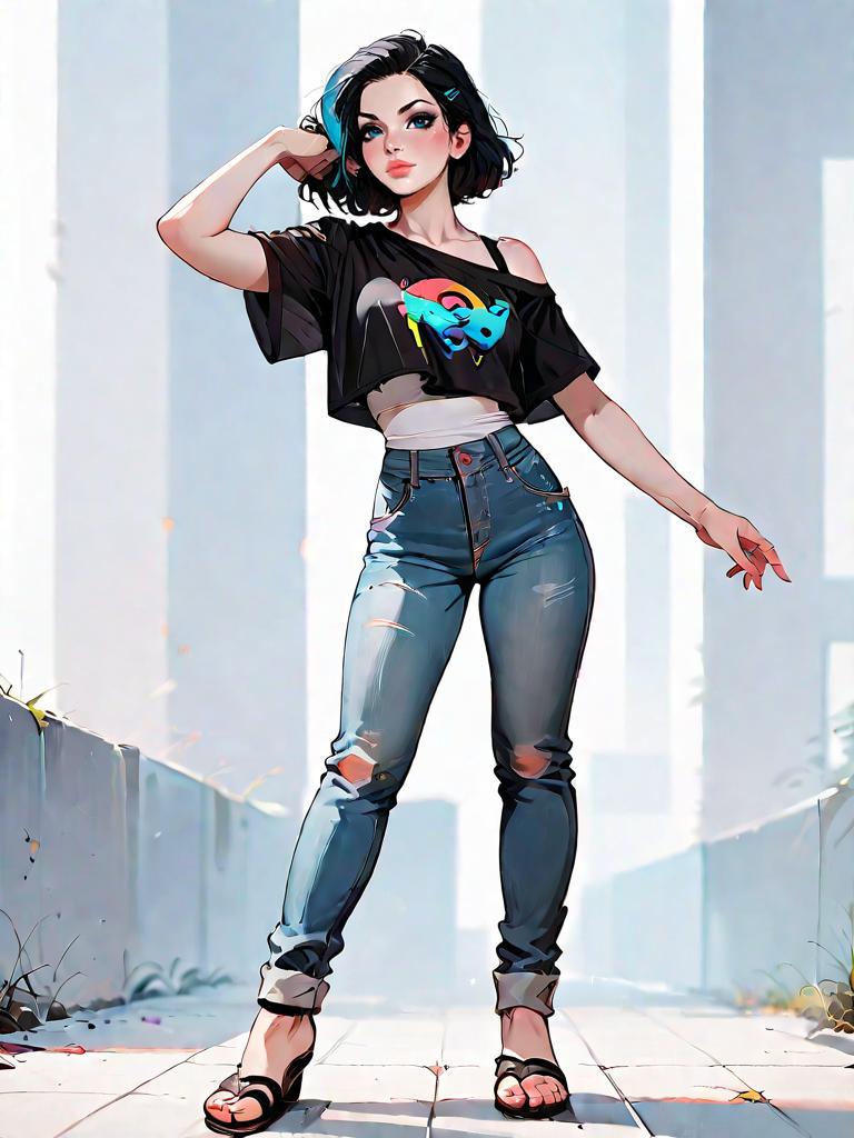 1girl, source_comics, realistic face, full body shot, Woman, casual streetwear, white graphic t-shirt, dark blue ripped skinny jeans, black and white patterned cardigan, metallic gold low-top sneakers, small black shoulder bag with chain strap, park with people and green chairs in the background.