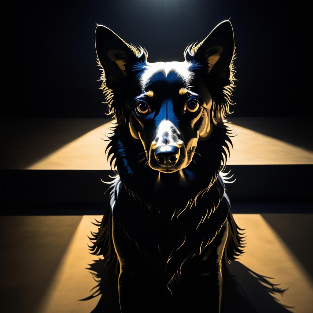 Mysterious Dog with Long Shadow in Dark Room