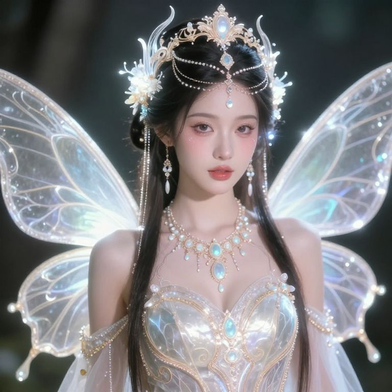 Photorealistic digital art of an ethereal Asian woman with glowing wings, wearing a radiant tiara, jeweled necklace, and translucent dress, set