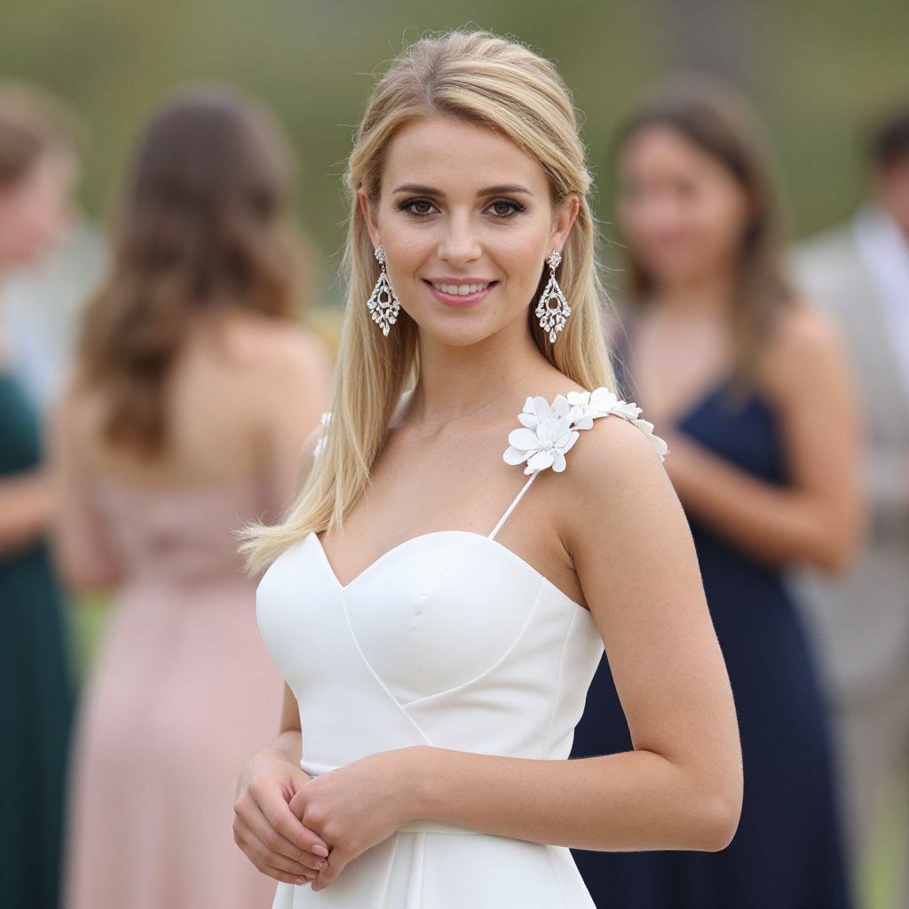 Portrait of a blonde woman wearing a white dress with floral shoulder detail and large crystal earrings. She is smiling and looking at the camera, standing outdoors with blurred people in the background.