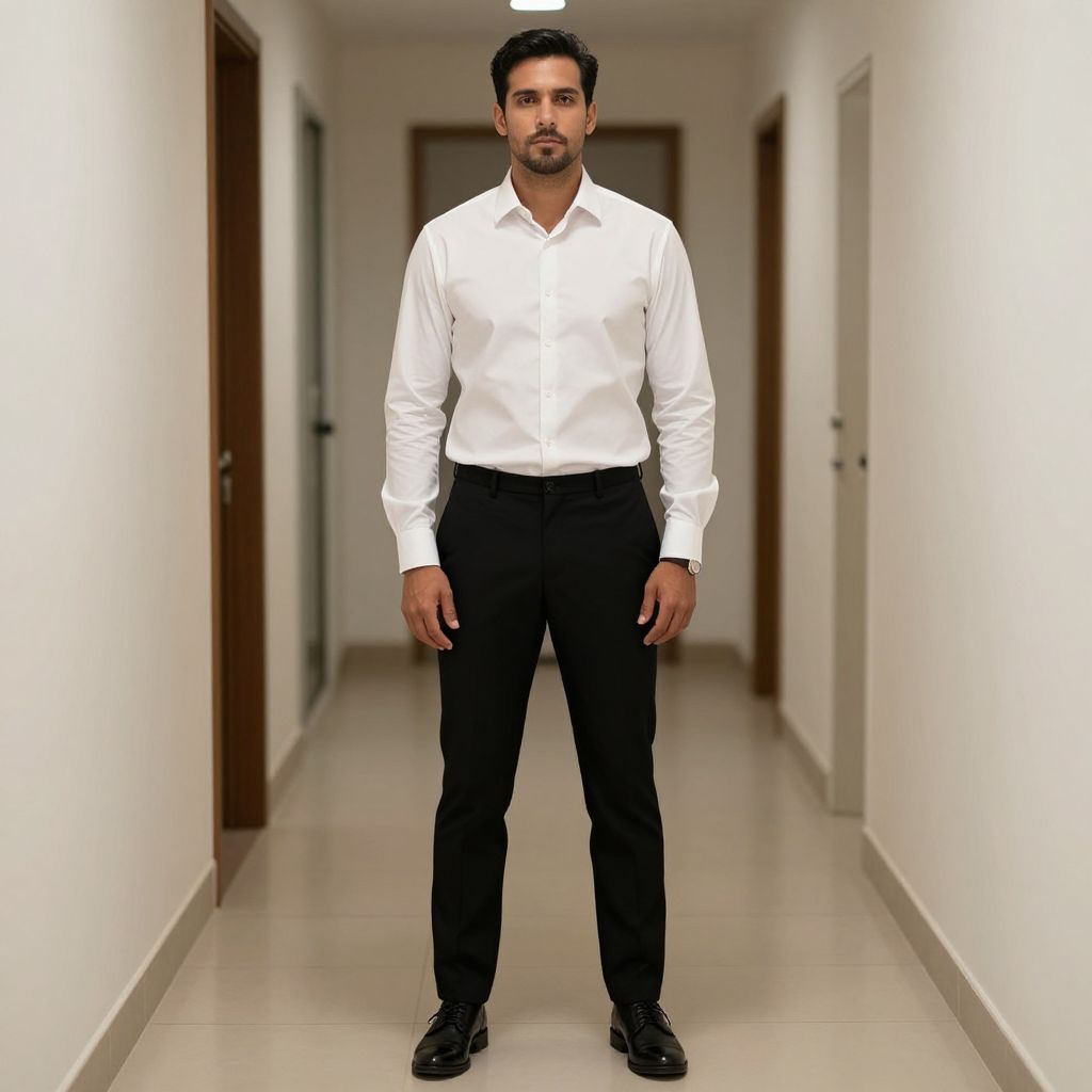 Photograph of a South Asian man standing in a long, white-walled hallway with wooden doors on both sides. He has short black hair, a trimmed beard, and is wearing a crisp white dress shirt with black trousers and black leather shoes. His stance is straight, with hands relaxed by his sides. The hallway's floor is glossy and beige, and the lighting is bright, creating a clean, minimalist look. The man's serious expression and formal attire suggest a professional setting. The image has a slight digital enhancement effect, making the colors and details appear slightly over-saturated.