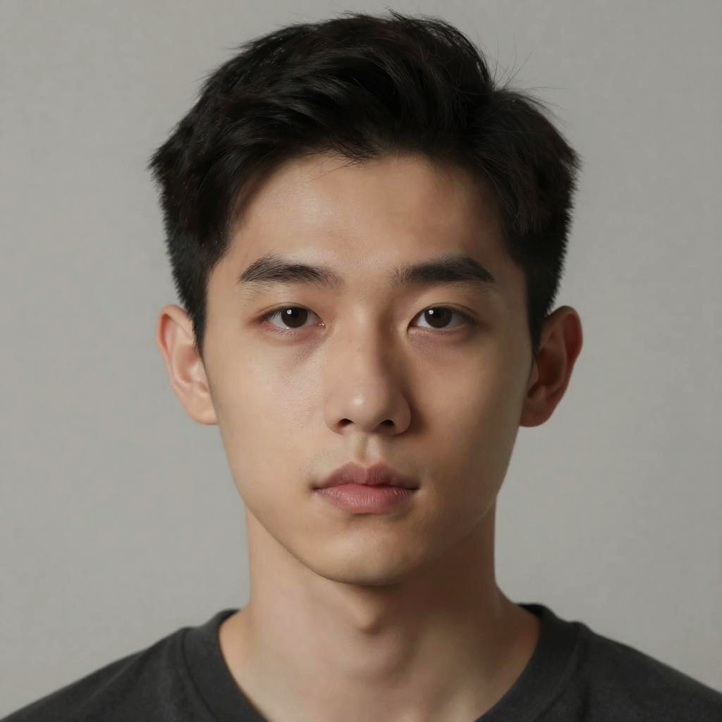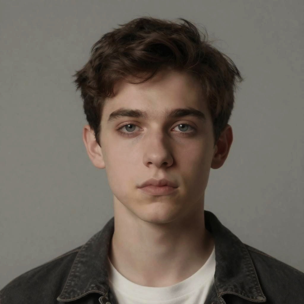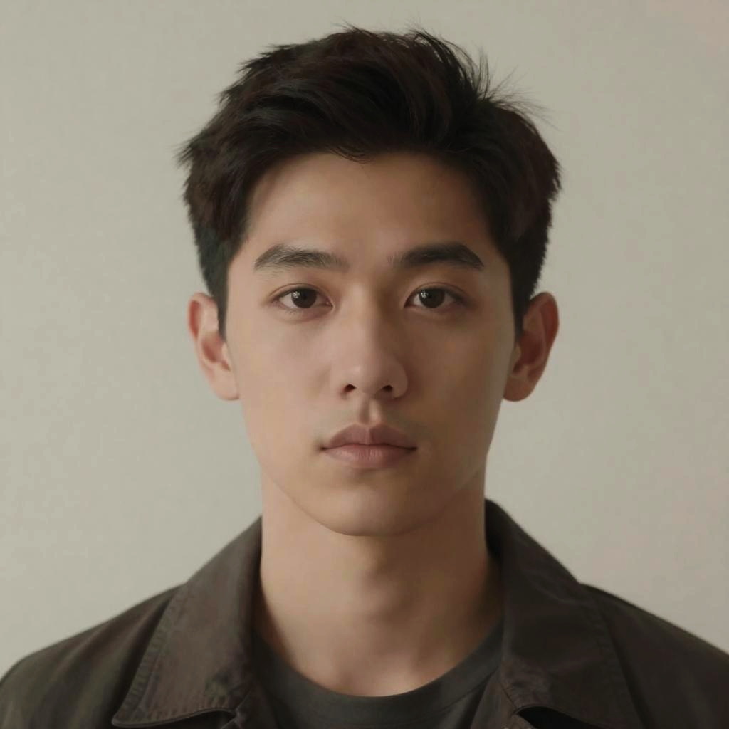 Young man wearing glasses and a blue jacket standing in a surreal fantasy forest with vibrant red and blue foliage and ethereal architectural structures in the background.