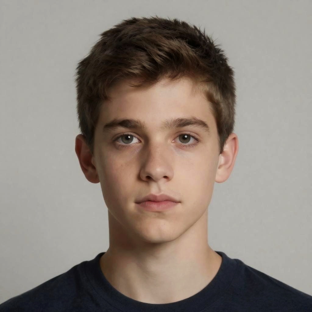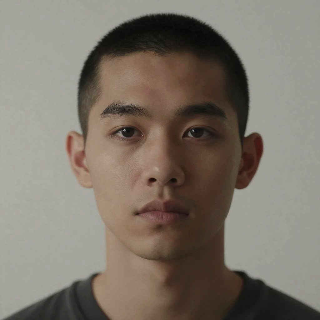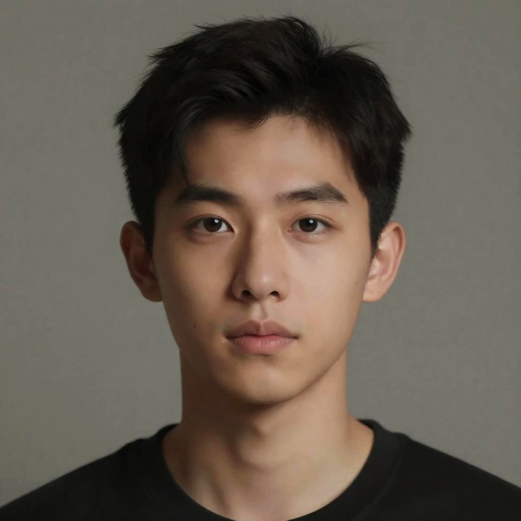 Young man wearing glasses and a blue jacket standing in a surreal fantasy forest with vibrant red and blue foliage and ethereal architectural structures in the background.