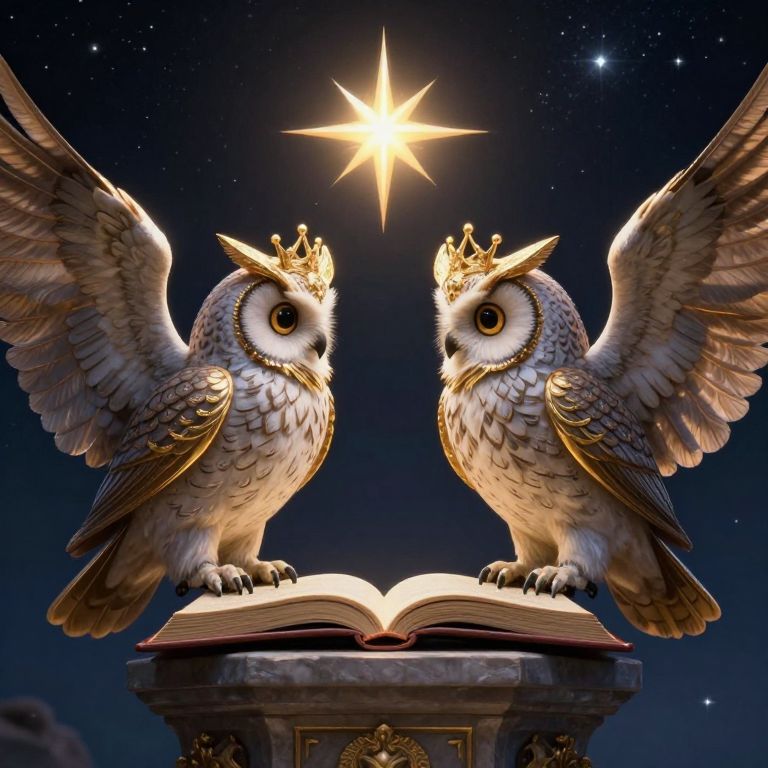 Two regal, winged owls adorned with golden crowns stand perched on a pedestal, engaged in a celestial debate over open books, set against a starry night sky with a radiant star above, rendered in a detailed digital art style with dramatic lighting and high-definition quality.