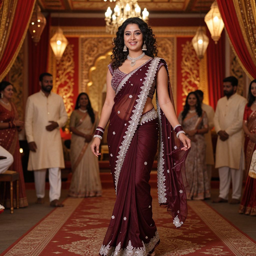 Photograph of a curly-haired Indian woman in a maroon traditional saree with silver embroidery, walking a luxurious, ornately decorated runway.