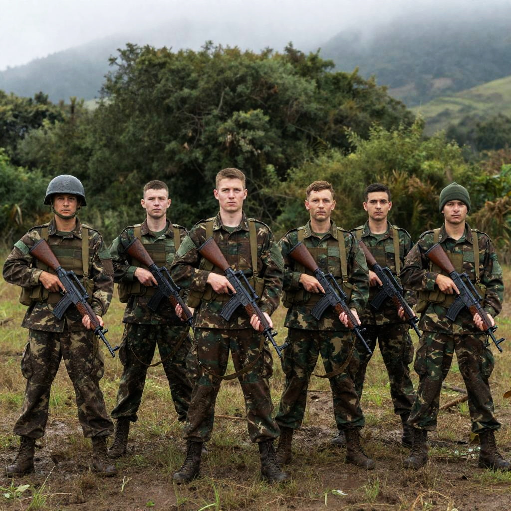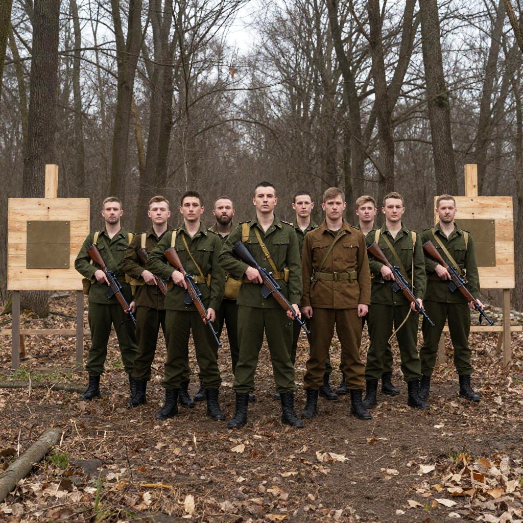 Photograph of ten soldiers in a forest, standing in a line. All wear green military uniforms, some with brown jackets. Nine hold rifles, one has a bow and arrow. Wooden targets with flaps on either side. Leafless trees in background. Soldiers' expressions neutral to serious. Forest floor covered in dry leaves.