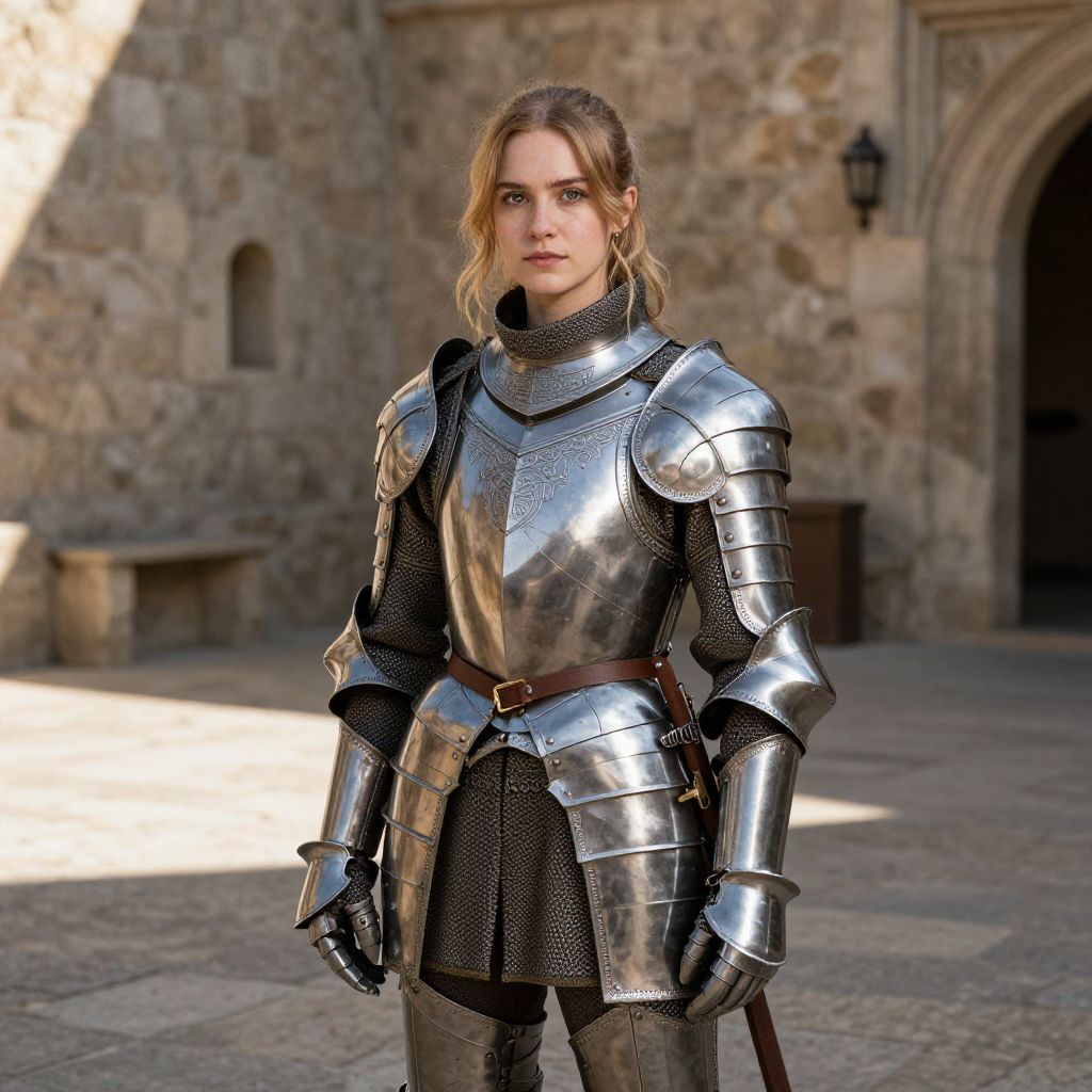 A young woman in brilliantly polished medieval armor stands confidently in a historic stone courtyard. Her striking gaze and the detailed design of her armor evoke a sense of strength and bravery, reminiscent of a heroic character from a fantasy epic. The warm light casts dramatic shadows, enhancing the image's captivating medieval atmosphere.