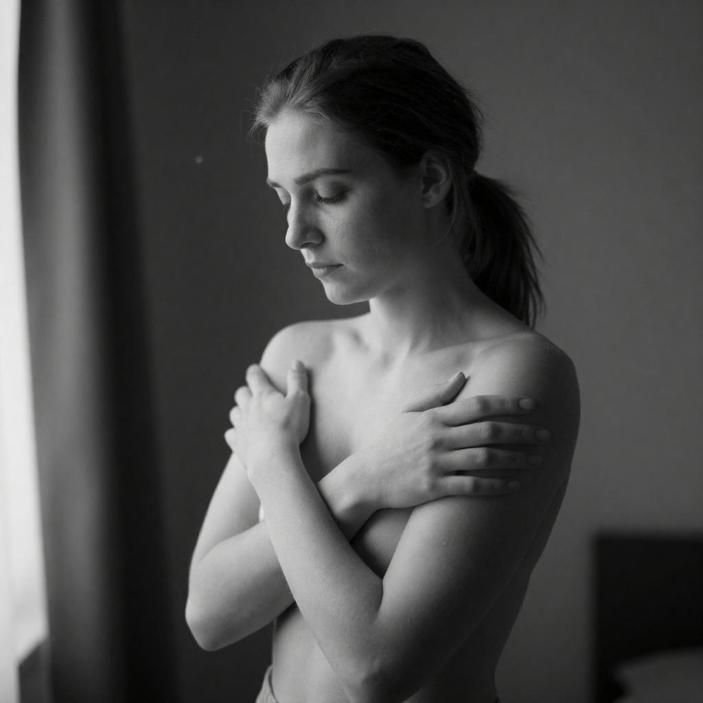 Black-and-white photograph of a topless woman with light skin and dark hair in a ponytail, standing in a dimly lit room. She covers her chest with her arms, illuminated by a bright light source from the left. Her expression is pensive, and a curtain is partially visible in the background.