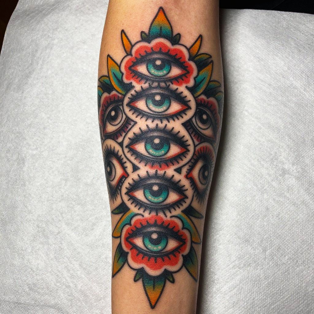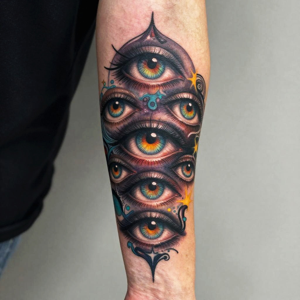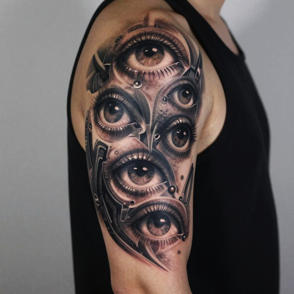 Multiple eyes tattoo, biomechanical theme with mechanical eyes embedded in robotic textures, dark tones with metallic highlights, futuristic and cyberpunk inspired design on upper arm