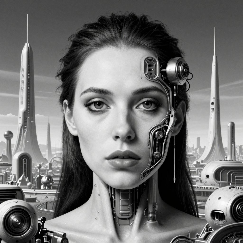 Digital artwork of a cybernetic woman with dark hair in a bun, futuristic cityscape background, circuitry and colorful LED patterns integrated into her face