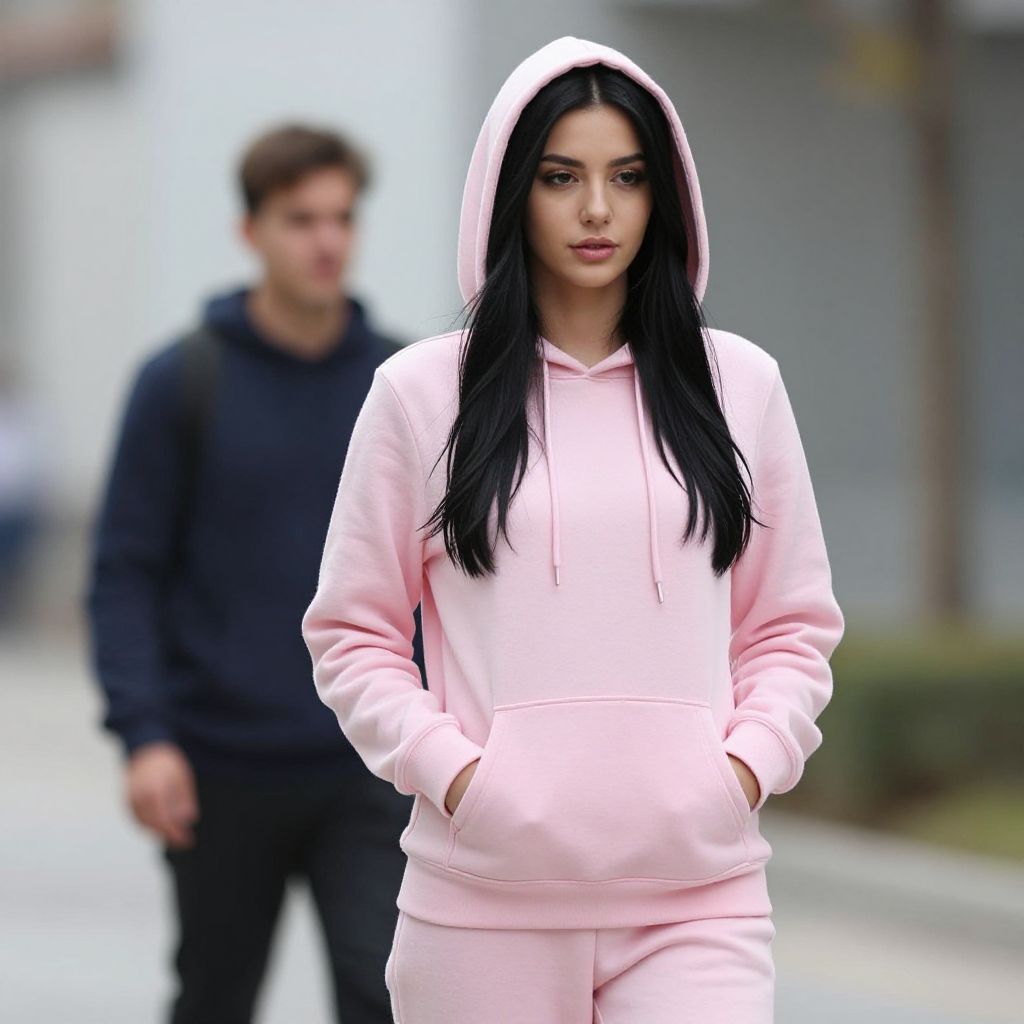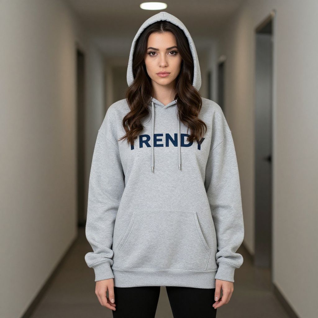 "Trendy Sweatshirt Woman Costume, woman in a gray hoodie standing in a hallway"