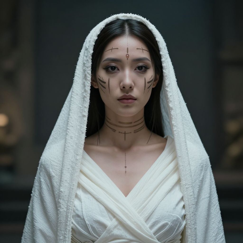 Photorealistic digital artwork of an Asian woman with straight black hair, wearing a white, textured robe with a hood that drapes over her head. She has white tribal-like marks on her face, a red dot on her forehead, and a choker with small crosses. Her expression is neutral, and she is centered against a dark, blurred background. The robe's fabric appears soft and slightly shiny, contrasting with the matte finish of her face marks. The overall mood is mysterious and serene, with a focus on her calm, intense gaze and traditional-inspired attire.