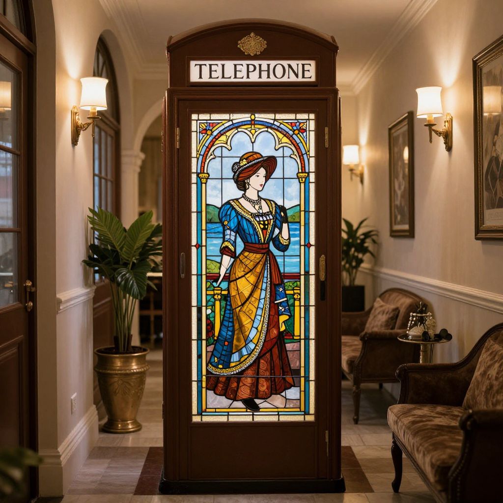 Stained-glass telephone booth stands prominently in a warmly lit hallway, featuring a detailed depiction of a woman in period attire, surrounded by intricate arches and vibrant hues, while flanked by sconces, potted plants, and elegant seating arrangements.