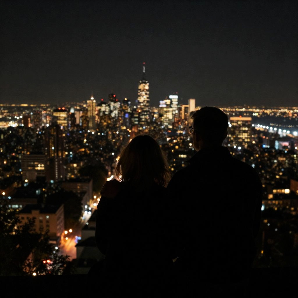 Nighttime photograph of a cityscape. Silhouetted couple stands in the foreground, facing the illuminated city. Man has short hair, woman has blonde hair. City lights form a bright, grid-like pattern. Dark sky above. Couple stands close, man's arm around woman's shoulders.