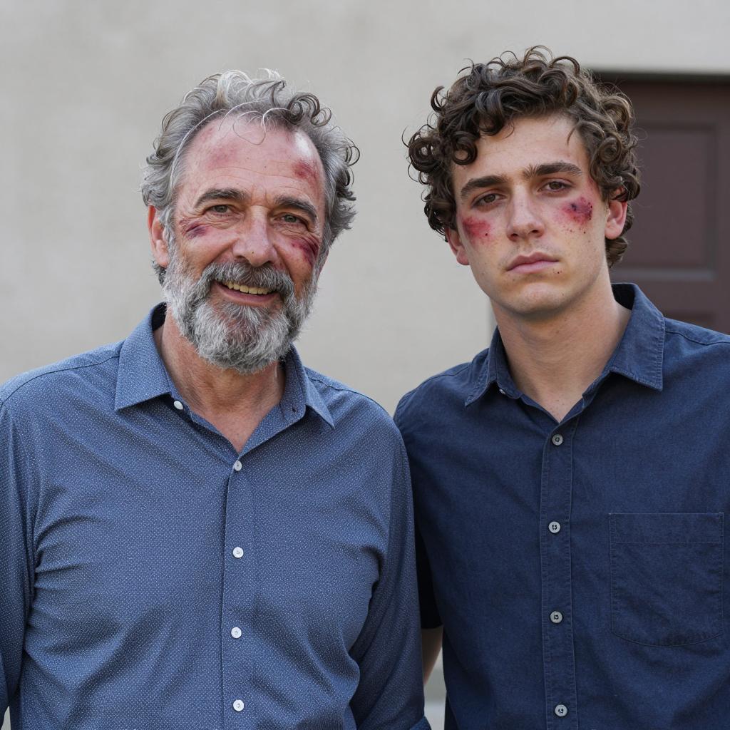 Two men with injured faces, one older with gray hair and beard in a blue patterned shirt, the other younger with curly brown hair in a dark blue shirt. Both have red marks on their faces. They stand side by side against a blurred background. The older man smiles, while the younger man looks serious.