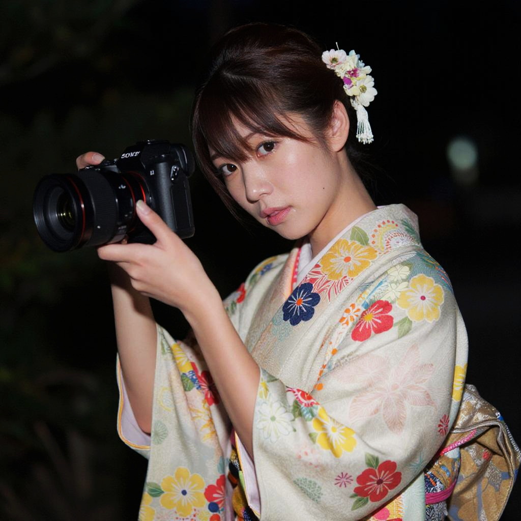 Photograph of an Asian woman in a floral kimono, holding a camera, with dark background, white hairpin, and soft lighting.