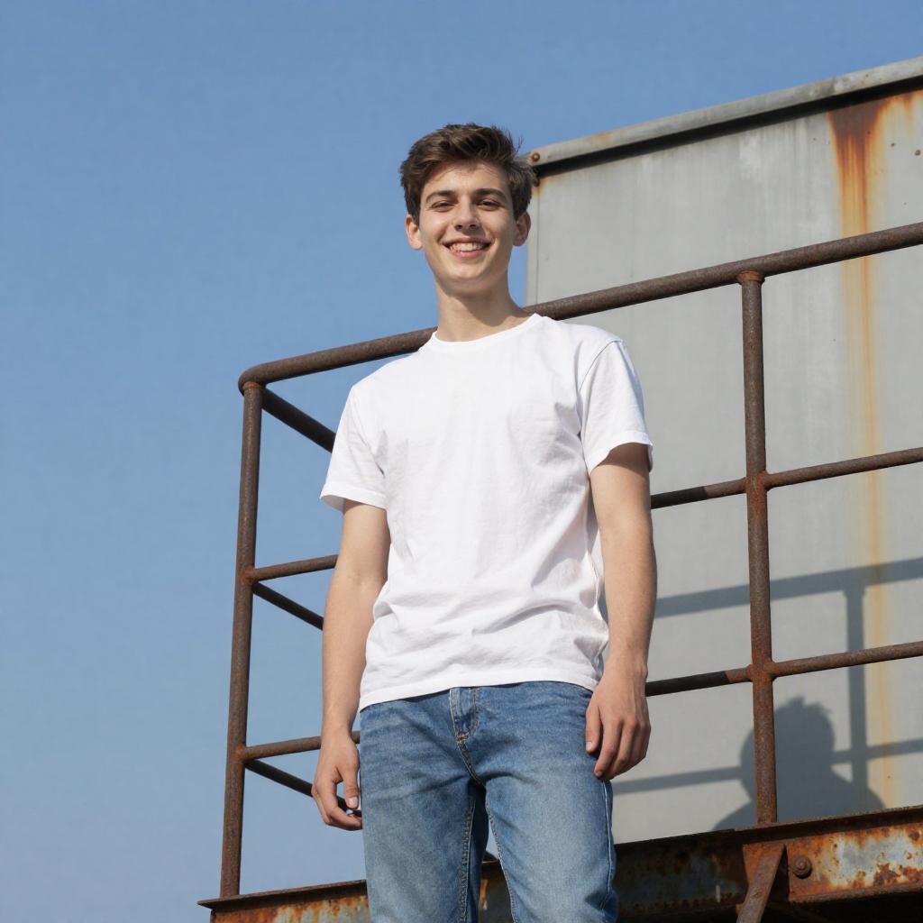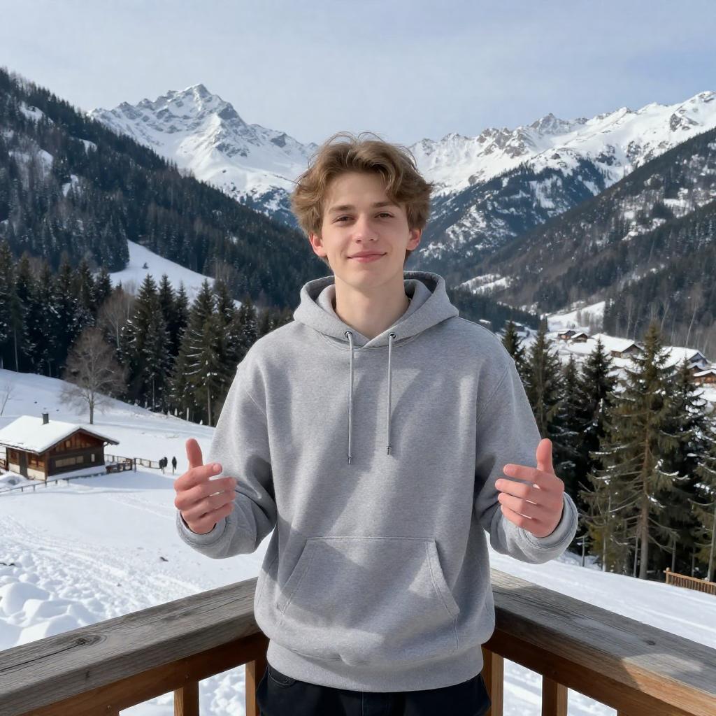 Young man with light brown hair, wearing a gray hooded sweatshirt, stands on a wooden balcony. Snow-covered mountains and forest in the background. He smiles, hands slightly raised. Bright daylight. Medium shot.