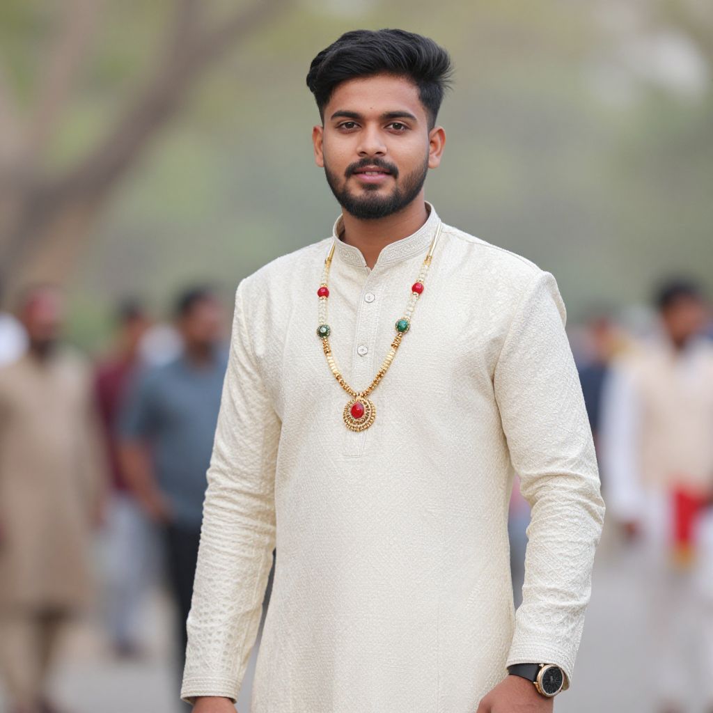 Bengali wedding sherwani, 1boy, male focus, solo, facial hair, beard, jewelry, black hair, flower, blurry, necklace, looking at viewer, mustache, blurry background, watch, long sleeves