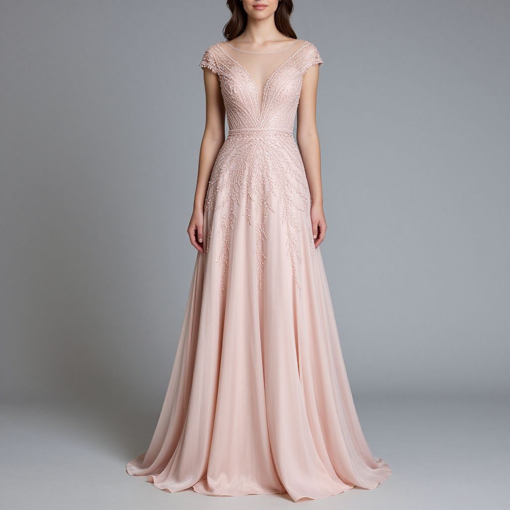Photograph of a slender woman with fair skin and long dark brown hair, wearing a floor-length, pale pink evening gown with a deep V-neckline and cap sleeves. The gown is adorned with delicate, sparkling embellishments that add a touch of elegance. The fabric is smooth and flowing, creating a subtle train at the bottom. She stands against a plain, light gray background, with her arms relaxed by her sides. The overall style is classic and sophisticated, suitable for formal events.