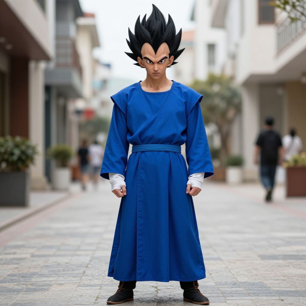 "Vegeta Blue Costume, man in a blue robe standing on a street"