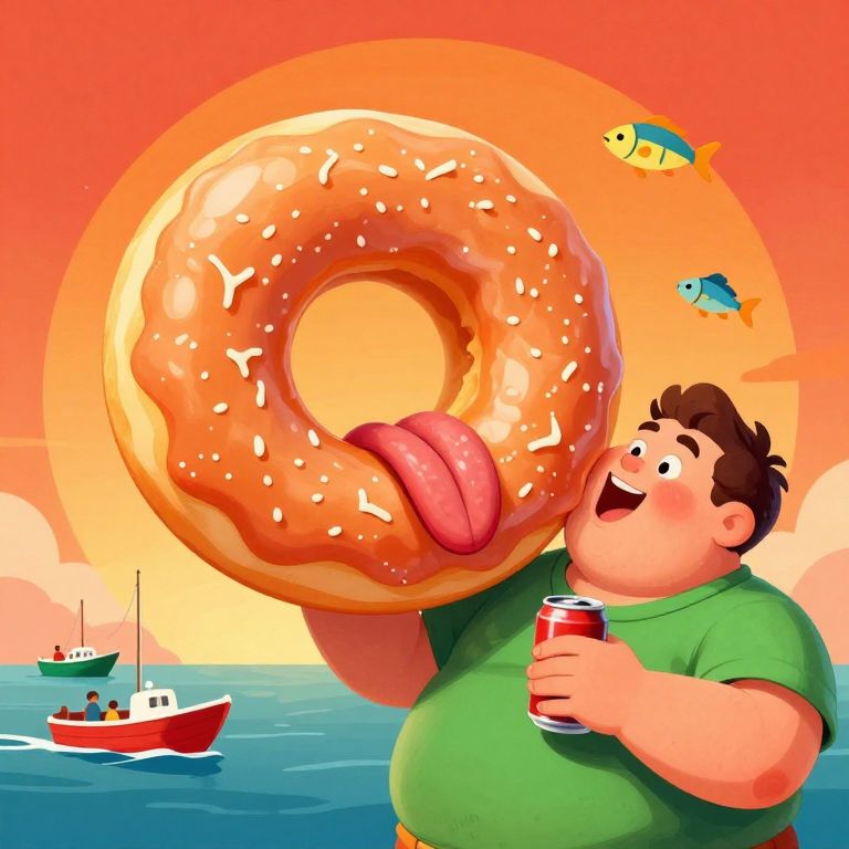 In this vivid and surreal illustration, a large, fat person is depicted in a humorous and exaggerated manner, seemingly about to bite into a giant donut. The person is wearing a green shirt and is holding a soda can in one hand, while the other hand is reaching towards the donut. The donut is enormous, with a mouth-like opening revealing sharp teeth and a tongue-like texture, giving the impression that it is alive and ready to consume the person. The background features a vibrant, warm color palette with a large, circular orange and red gradient, adding to the surreal and whimsical atmosphere. Small fish are swimming around the donut, adding to the playful and fantastical scene. In the distance, there are two boats, one red and one green, with people on board, suggesting a seaside or coastal setting. The overall composition is dynamic, with the person and the donut being the central focus, while the background elements provide context and depth to the scene.