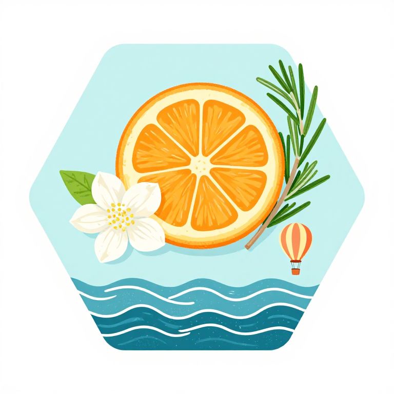 Figurative flat drawings within an tall hexagon that contains one orange slice, jasmine flower, rosemary twig, calm sea wave lines, hot baloon, style collage art,